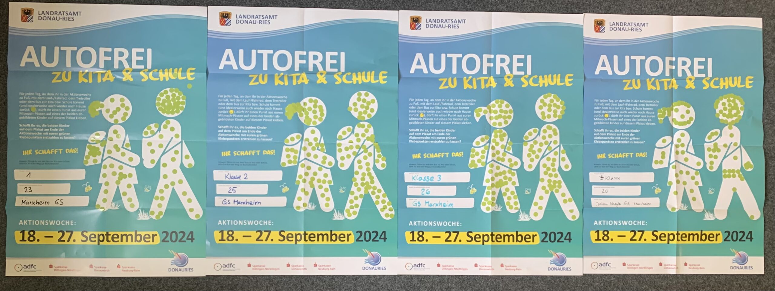 Vom 18. bis zum 27. September 2024 beteiligte sich die Grundschule Marxheim an der Aktion des Landkreises Donau-Ries “Autofrei zu Kita und Schule”. Die Kinder verzichteten, soweit es möglich war, bewusst auf das Elterntaxi zur Schule und bewältigten den Schulweg zu Fuß oder mit dem Roller. An jedem Tag, den ein Kind zu Fuß zur Schule oder zur Bushaltestelle kam, durfte es einen grünen Punkt auf das Aktionsplakat kleben. So wurde gleich zu Schuljahresbeginn die Bewusstheit gefördert, die Schule unmotorisiert zu erreichen. Diese Bewegung am frühen Morgen bringt den Kreislauf gut in Schwung und versorgt den Körper kräftig mit Sauerstoff.