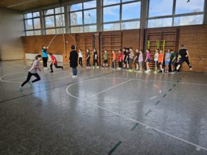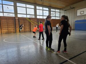 Am Mittwoch, den 27. November, nahm die 4. Klasse am Projekt „Skipping Hearts“ der deutschen Herzstiftung teil. Nach einem Warmlaufen am großen Seil zeigte die Workshopleiterin Andrea Voina den Kindern verschiedene Sprungvariationen, welche allein oder mit einem Partner ausgeführt wurden. Abschließend durften die Viertklässler zeigen, was sie geübt haben und ihr Können vor den Schülern der 1. und 2. Klasse sowie einigen interessierten Eltern präsentieren.