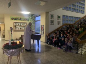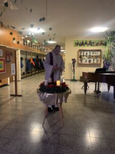 Am ersten Adventsmontag fand zu Schulbeginn im Foyer der Schule eine besinnliche Adventsfeier mit statt. Herr Höchenberger erzählte den Kindern eine Geschichte zum Adventskranz und segnete diesen im Anschluss. So starteten die Kinder adventlich eingestimmt in die Schulwoche.