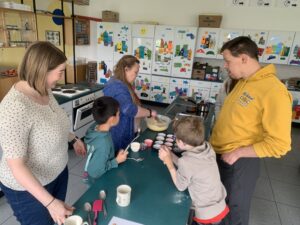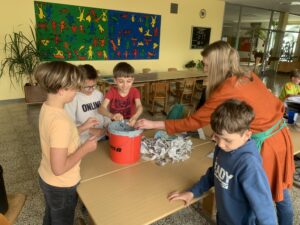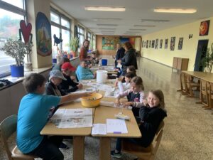Dank der großartigen Unterstützung aller Workshopleiter war es möglich, ein buntes Programm an vielseitigen Aktionen anzubieten. Es fanden Teambildungsspiele in der Turnhalle, gemeinsames Singen, Spiele der Marxheimer Feuerwehr, Sport und Gesellschaftsspiele statt. In anderen Kursen stand das kreative Tun im Vordergrund. Im Werkraum wurden unter Anleitung der Stiftungsbetreuer Stelzen hergestellt. Die Schüler durften Holzbretter kreativ bemalen, die später als Ablagen für die Brotboxen an den Trögen im Pausenhof montiert werden sollen. Die Kinder bastelten Lesezeichen, Papierrosen oder Brottütenlaternen. Es wurden zum einen Herzchen aus Papier gefertigt und zum anderen stellte die Seniorengruppe aus der Stiftung zusammen mit den Kindern Samenherzen und – blumen her, damit jeder als Andenken an unsere gemeinsame Zeit diese beiden Präsente mit nach Hause nehmen konnte. Raum für Ruhe bot der Vorlese- Workshop von Frau Gruber, bei dem die Zuhörer ganz entspannt einer Olchi-Geschichte lauschten. Schließlich gab es auch noch die sehr begehrten kulinarischen Workshops, in denen Muffins und Pizzaschnecken für unser abschließendes Buffet produziert wurden. Dieses tolle und vielfältige Angebot war nur möglich, da sich so viele Helfer bereit erklärt hatten, im Rahmen unserer gemeinsamen Tage einen Workshop anzubieten oder anderweitig mitzuhelfen.