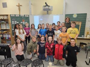 Am Mittwoch, den 30.7.2025, wurden die Schüler der 4. Klasse in der Aula der Grundschule verabschiedet. Umrahmt wurde die Feier von drei Bläser-Stücken, die Herr Erwin Kitzinger mit Schülern aus den Klassen 2 bis 4 einstudiert hatte.