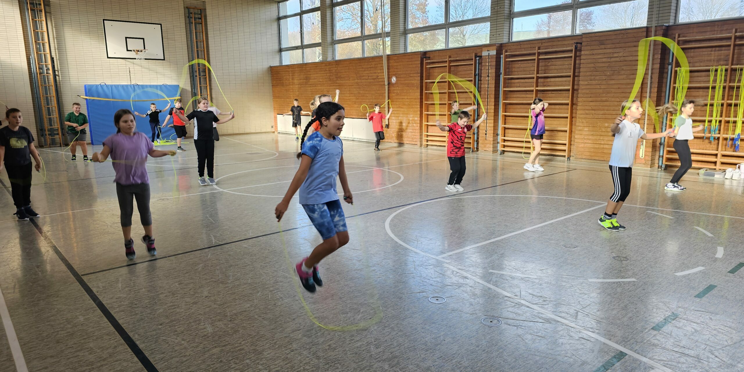 Am Mittwoch, den 27. November, nahm die 4. Klasse am Projekt „Skipping Hearts“ der deutschen Herzstiftung teil. Nach einem Warmlaufen am großen Seil zeigte die Workshopleiterin Andrea Voina den Kindern verschiedene Sprungvariationen, welche allein oder mit einem Partner ausgeführt wurden. Abschließend durften die Viertklässler zeigen, was sie geübt haben und ihr Können vor den Schülern der 1. und 2. Klasse sowie einigen interessierten Eltern präsentieren.